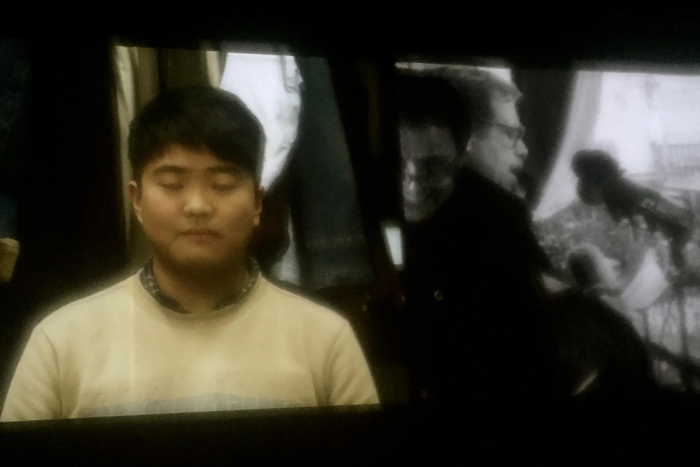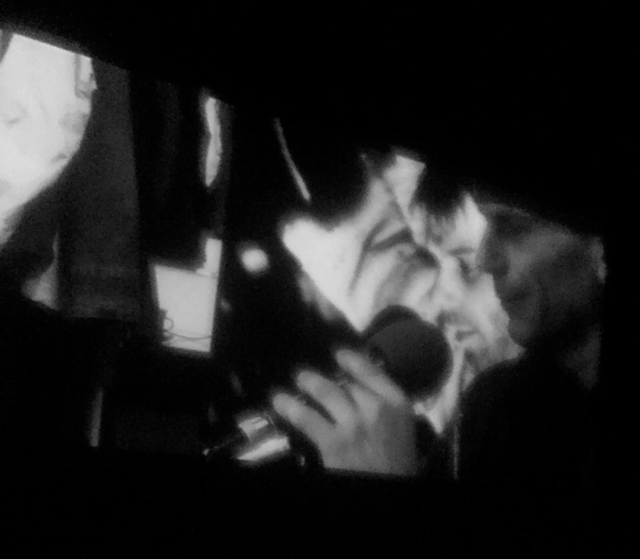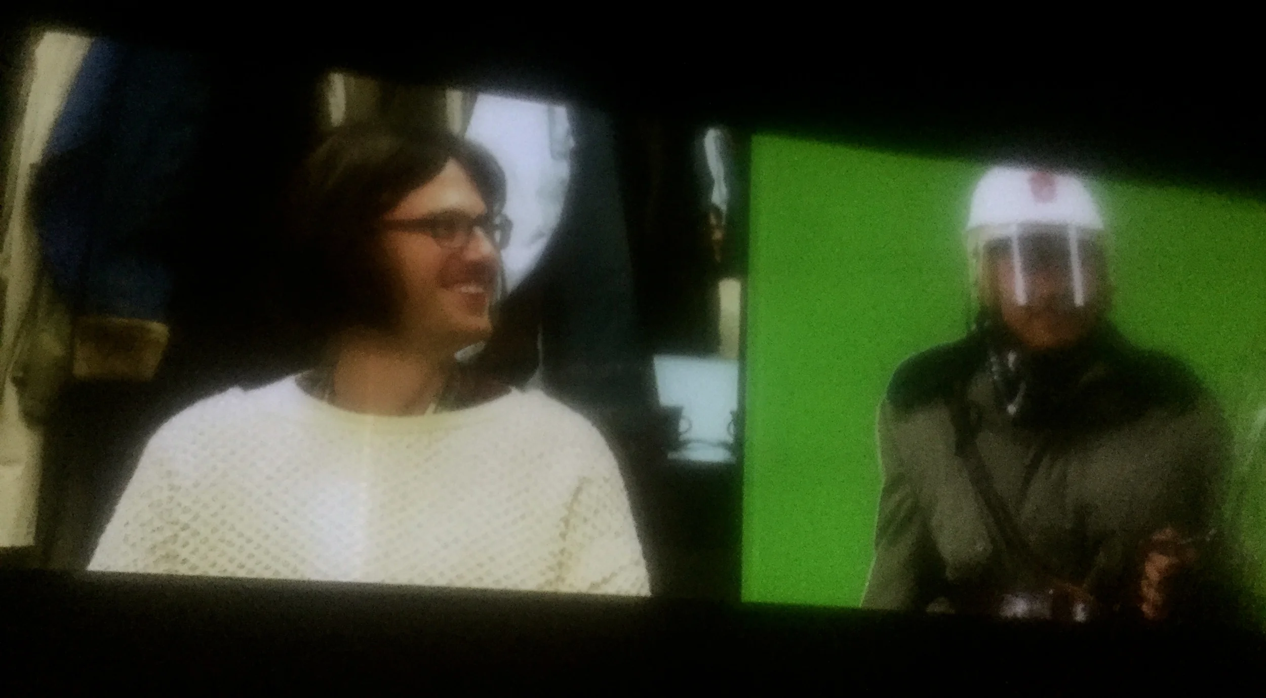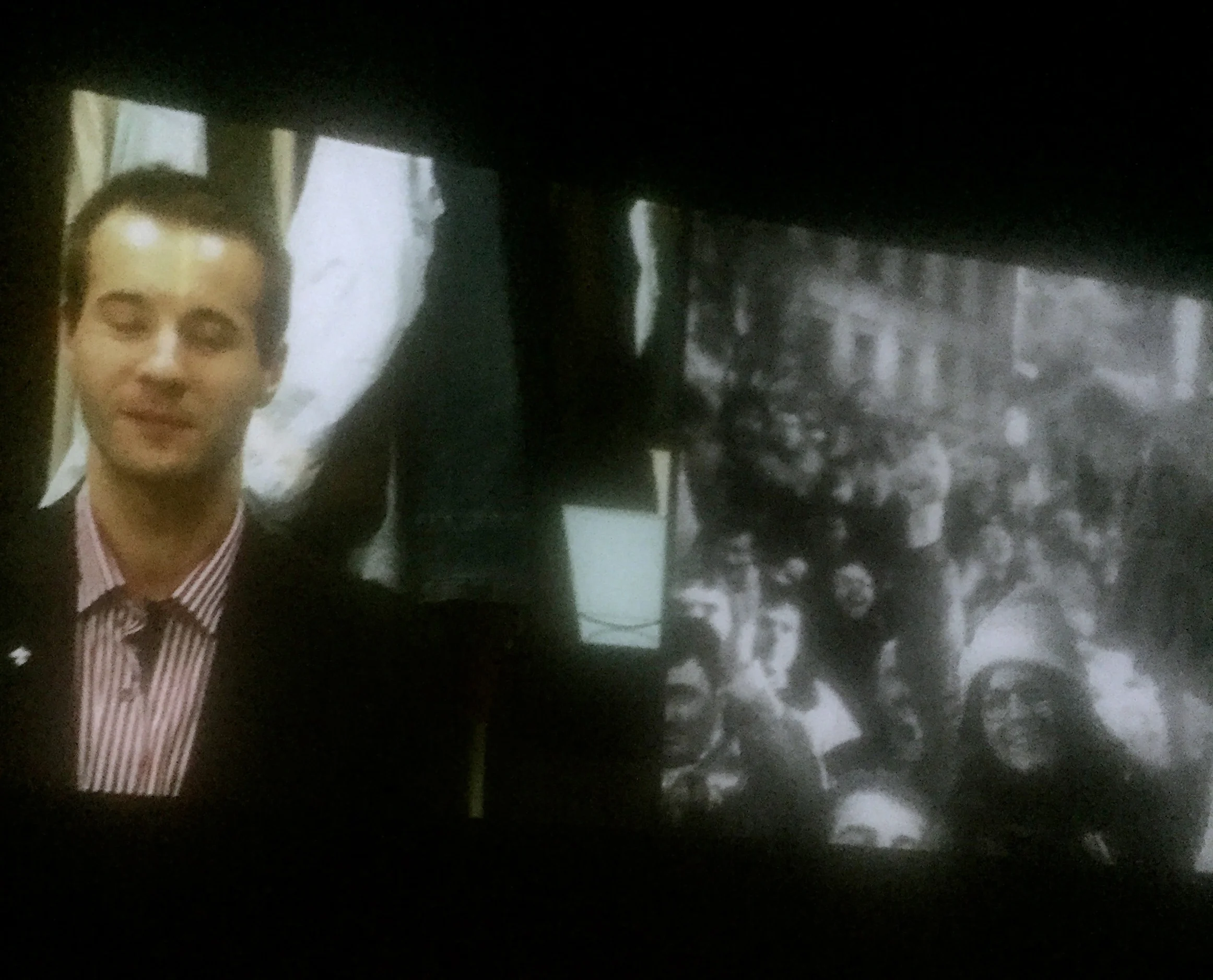 We watched a three step process on a split screen - 1. the actors getting dressed and made up in costumes and make up in their chosen role (of one of the people who was there that night - people up on the balcony Havel and his compatriots as well as people in the crowd and the police. 2. the actors moving to the second screen and being interviewed by Lola and then finally stepping into a film or photograph from the actual night and reading (with direction) the speech and bring us back to the reality of that revolutionary night through the fantasy of present tense imaginations and embodiment.